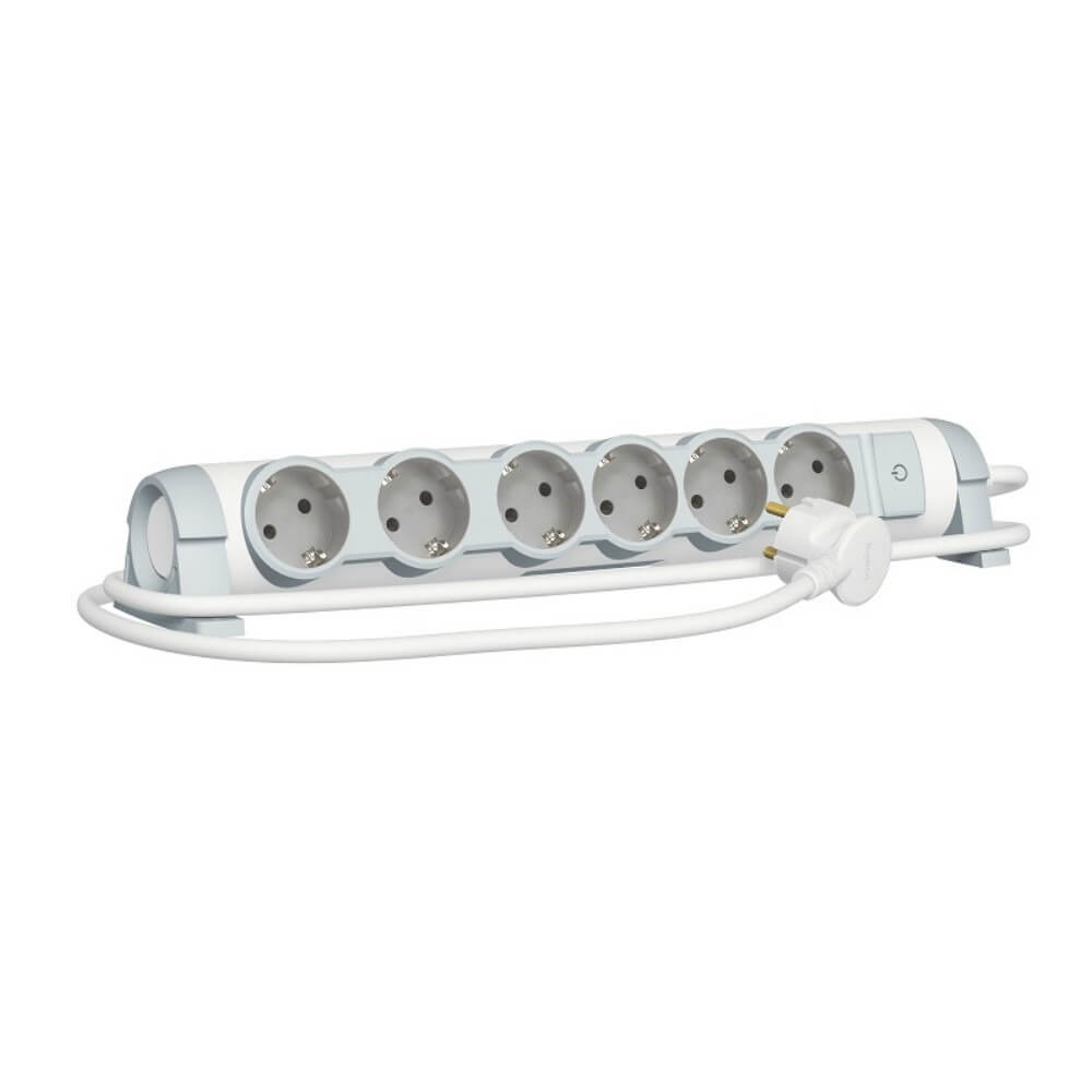 Bases múltiples confort – Para conectar varios dispositivos equipados o no con toma de tierra: electrodomésticos clase I (aislamiento simple) o clase II (aislamiento doble), lámparas, PC, TV, equipo de música, etc. – Interruptor ON/OFF con indicador luminoso, manipulable con el pie o con la mano – Con obturadores de protección para 10.000 maniobras – Tomas de corriente orientables – Espacio óptimo entre 2 tomas para conectar transformadores, cargadores, etc. – Con accesorio recogecables – Fijación a la pared o superficie de trabajo mediante tornillo – Cable de alimentación de 1,5m de 3×1 mm2 – Potencia máx. 3650 W a 230 V – 6 x 2P +