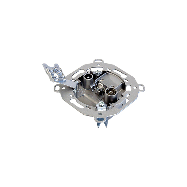 Toma terminal con dos conectores CEI. El de la izquierda es un CEI macho para TV terrestre y el de la derecha es un CEI hembra para radio (FM).